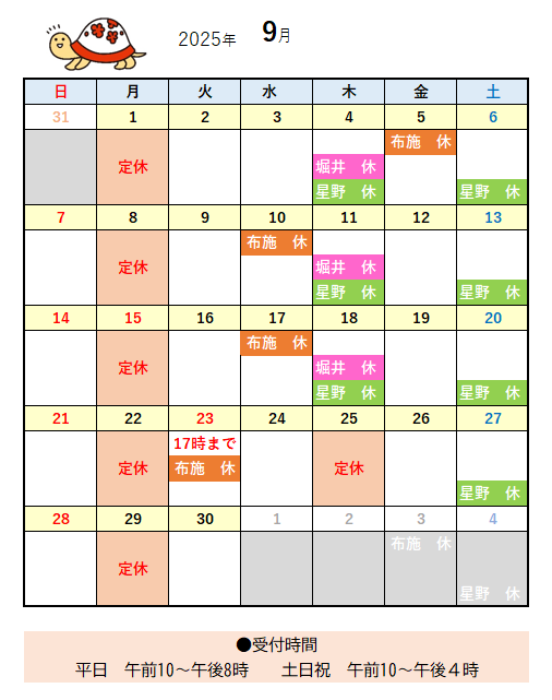 2025.09.02 お知らせ 2025年9月 営業カレンダー ikegami-staff 9月に入っても猛暑が続いています。段々涼しくなってくると、夏の疲れが出やすくなりますので、無理をせず休養をしっかりとりましょう。 温かい飲み物を取り入れるだけでも体がほっとします。 元気に過ごせるよう、今月も健康を意識していきましょう! ABOUT ME いけがめちゃんいけがみ整体院広報担当FacebookContact今年で100歳になりました! 長い間肩こりと腰痛に悩んでいましたが、いけがみ整体院で働くようになってとても良くなりました!